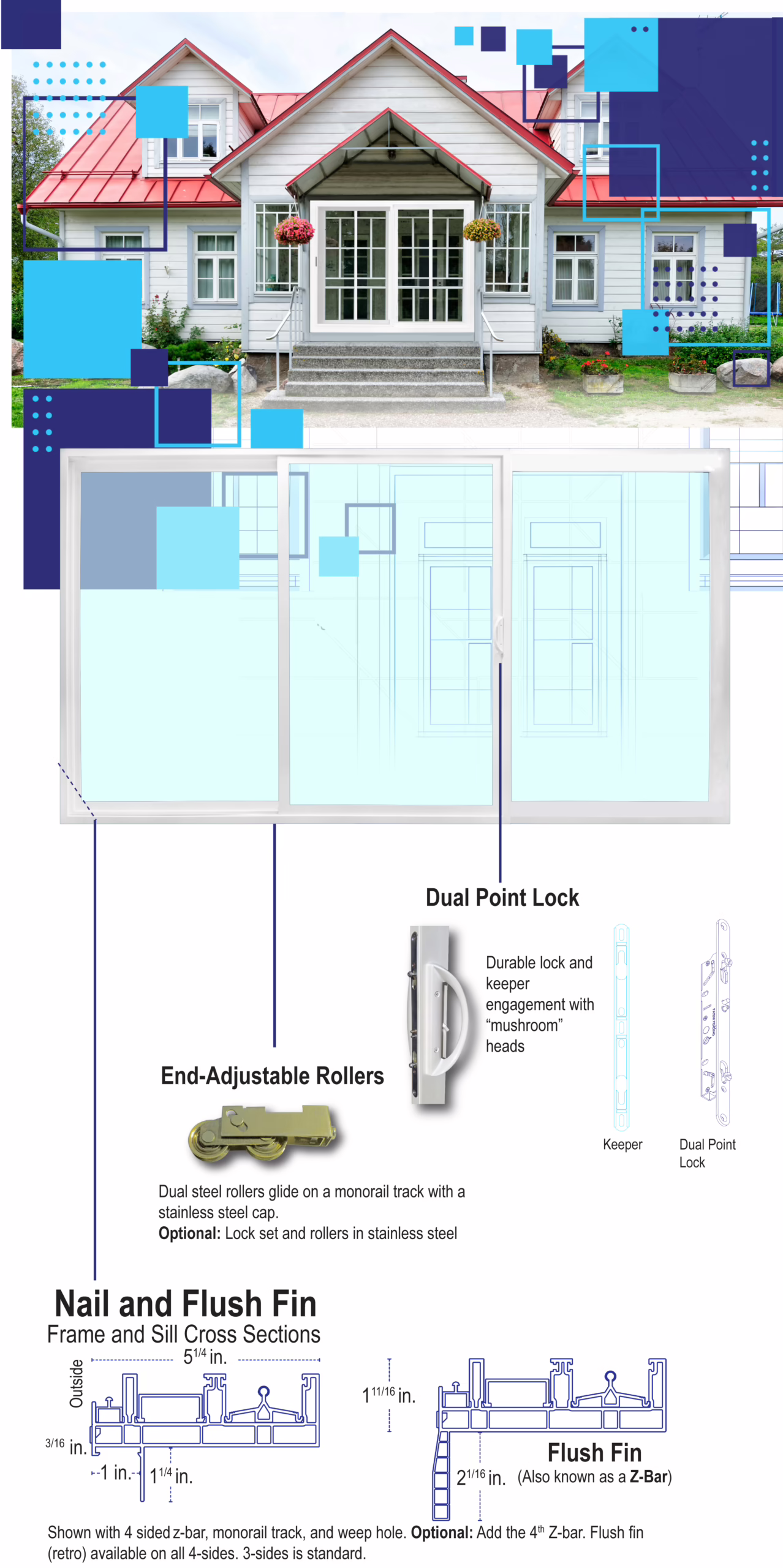 - Includes a built-in nail flange (also called a nailing fin) that attaches to the rough opening of the wall.